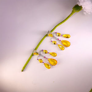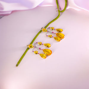 These chandelier earrings reflect the warm glow of a sunset with a soft yellow tone that adds radiance to any outfit. Their cascading design is perfect for festive flair or adding elegance to daywear.