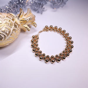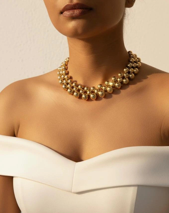 A bold collar-style necklace that reflects the warm radiance of the golden hour.
